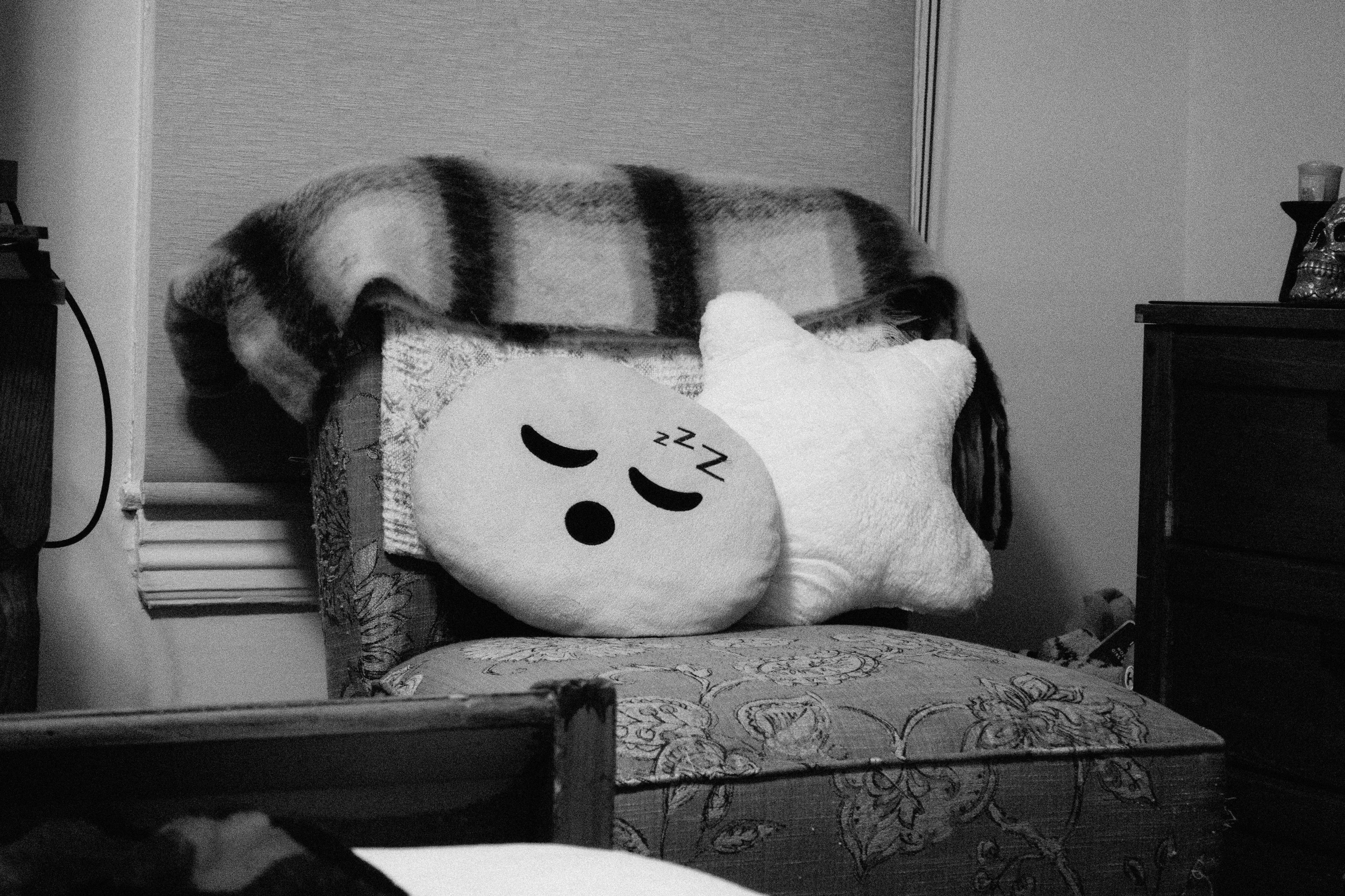 This photograph captures a serene corner of a room featuring soft, plush pillows in the shapes of a ghost and a star, set against a textured backdrop of a cozy blanket. The monochrome tones enhance the peaceful mood, evoking a sense of warmth and comfort within the intimate space. The composition draws the eye to the cuddly subjects, inviting a feeling of nostalgia and tranquility.
