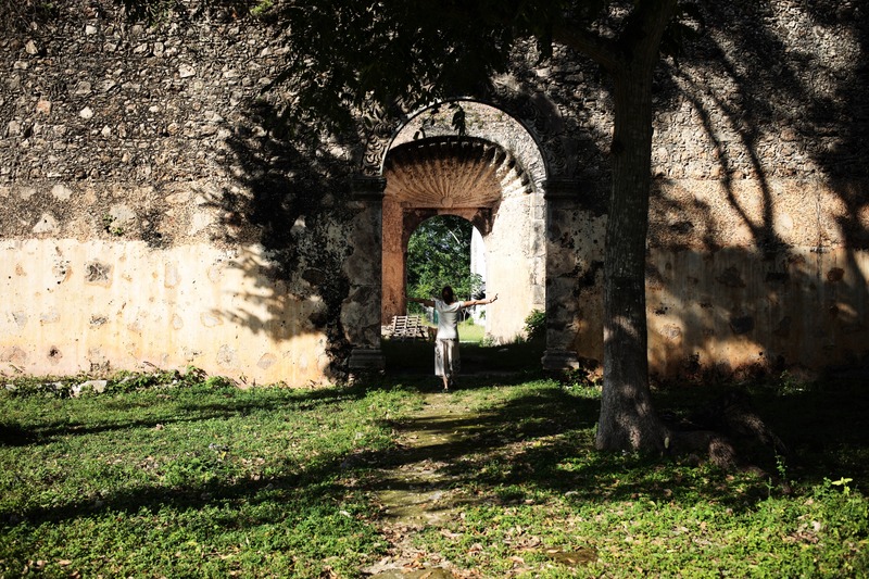 A figure walks gracefully through a weathered archway, embraced by the remnants of an ancient stone structure. The soft, dappled sunlight filters through the trees, casting enchanting shadows on the ground, enhancing the sense of nostalgia and wonder. The scene evokes a serene exploration of forgotten beauty, inviting contemplation and reverie.