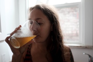 A woman takes a contemplative sip from a clear glass filled with amber liquid, her eyes softly focused. The natural light streaming through the window illuminates her tousled hair and the intimate setting, creating a serene and introspective atmosphere. The composition balances the subject with the simple, homey background, inviting viewers into this quiet moment.