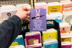 A hand holds a quirky birthday card featuring a playful pink bunny wielding a toy gun, playfully inscribed with the humorous phrase about zombies. The surrounding display of colorful greeting cards adds a cheerful yet surreal atmosphere, contrasting the card's unexpected theme. Bright lighting enhances the vibrant colors, creating an inviting and lighthearted mood in the scene.
