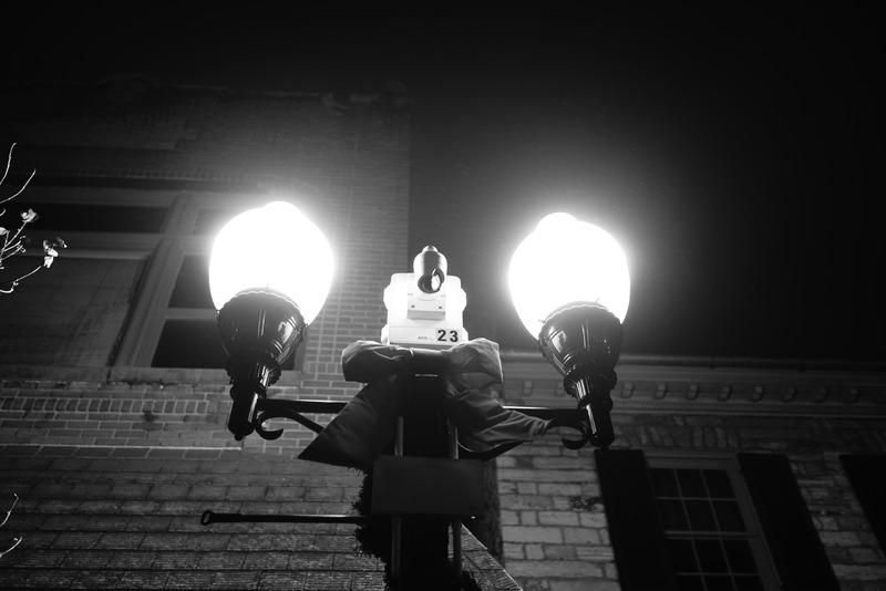 In this striking black-and-white photograph, the glowing street lamps dominate the frame, casting an almost ethereal light against a darkened building facade. The juxtaposition of harsh illumination and deep shadows creates a haunting, yet serene atmosphere, evoking a sense of solitude. The meticulous composition draws the viewer's gaze upward, inviting contemplation about the intersection of light and darkness.