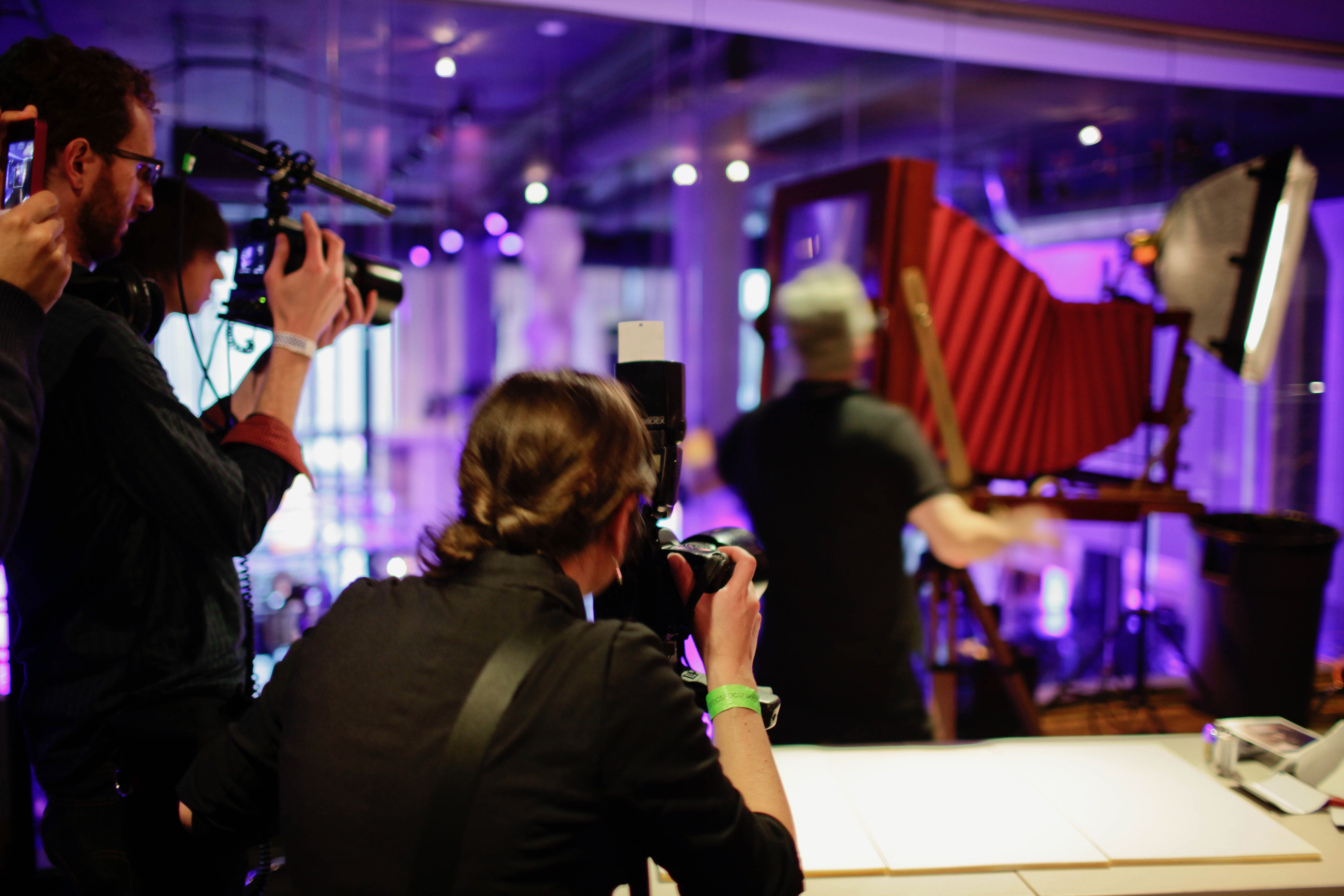 The photograph captures a dynamic moment in a bustling photography event, where multiple photographers are focused on their subjects. The soft, moody lighting, infused with hues of purple and warm tones, enhances the creative atmosphere, while the visible equipment hints at a blend of modern and traditional photography techniques. The scene conveys a sense of urgency and excitement, as each participant is absorbed in their craft amidst an enchanting backdrop.