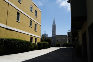 The photograph captures a narrow urban alley framed by yellow and gray buildings, leading the eye towards a towering skyscraper in the distance. The sunlight casts sharp shadows on the pavement, creating a stark contrast between light and dark areas, while the blue sky adds a vibrant touch to the scene. This composition evokes a sense of both confinement and openness, highlighting the interplay between human structures and the expansive city skyline.