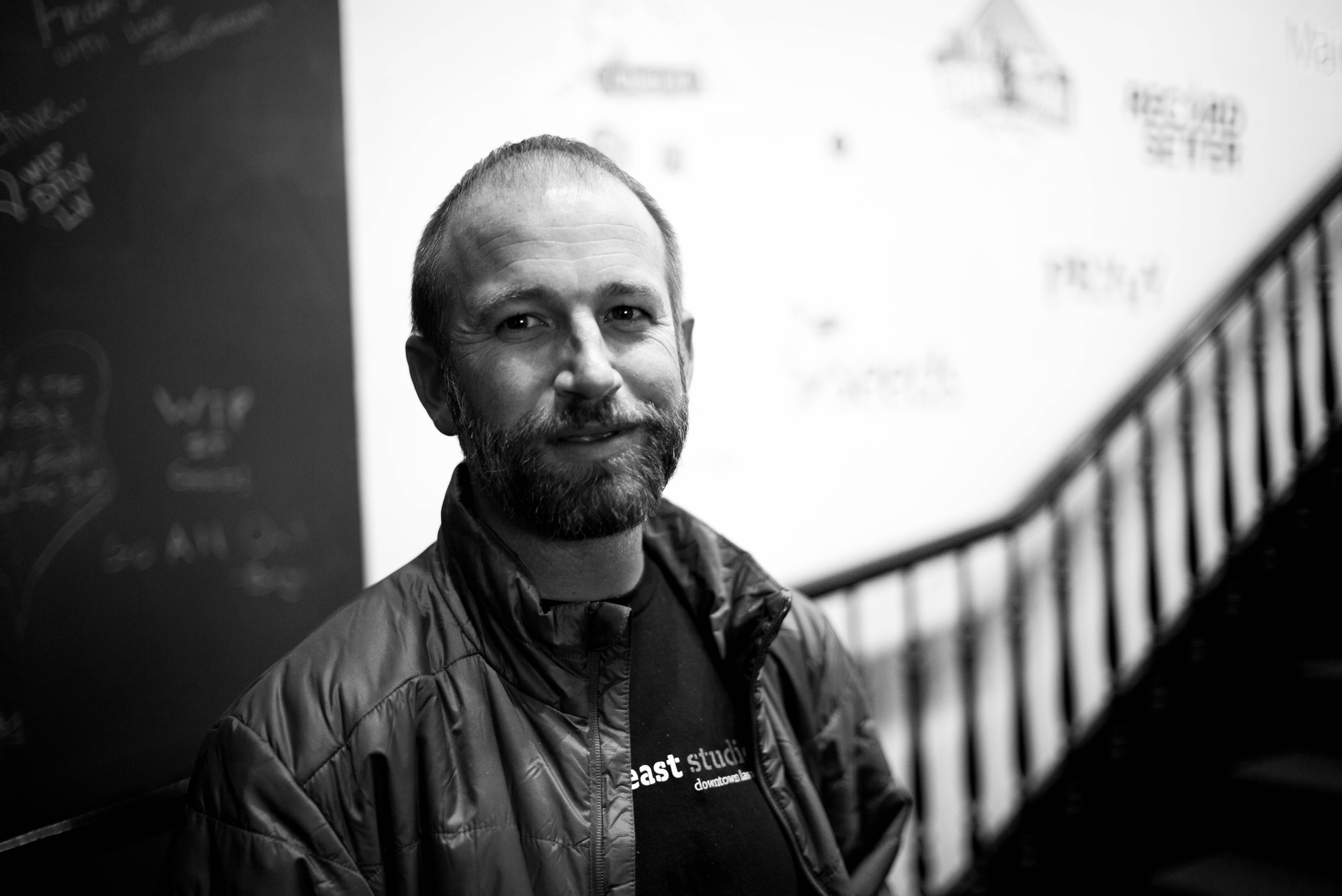 In this monochrome photograph, a man with a thoughtful smile appears against a softly blurred background, hinting at a creative space. The lighting is warm yet subdued, highlighting his features and creating a serene atmosphere. The interplay of shadows and the clean lines of the staircase add depth and character to the composition.