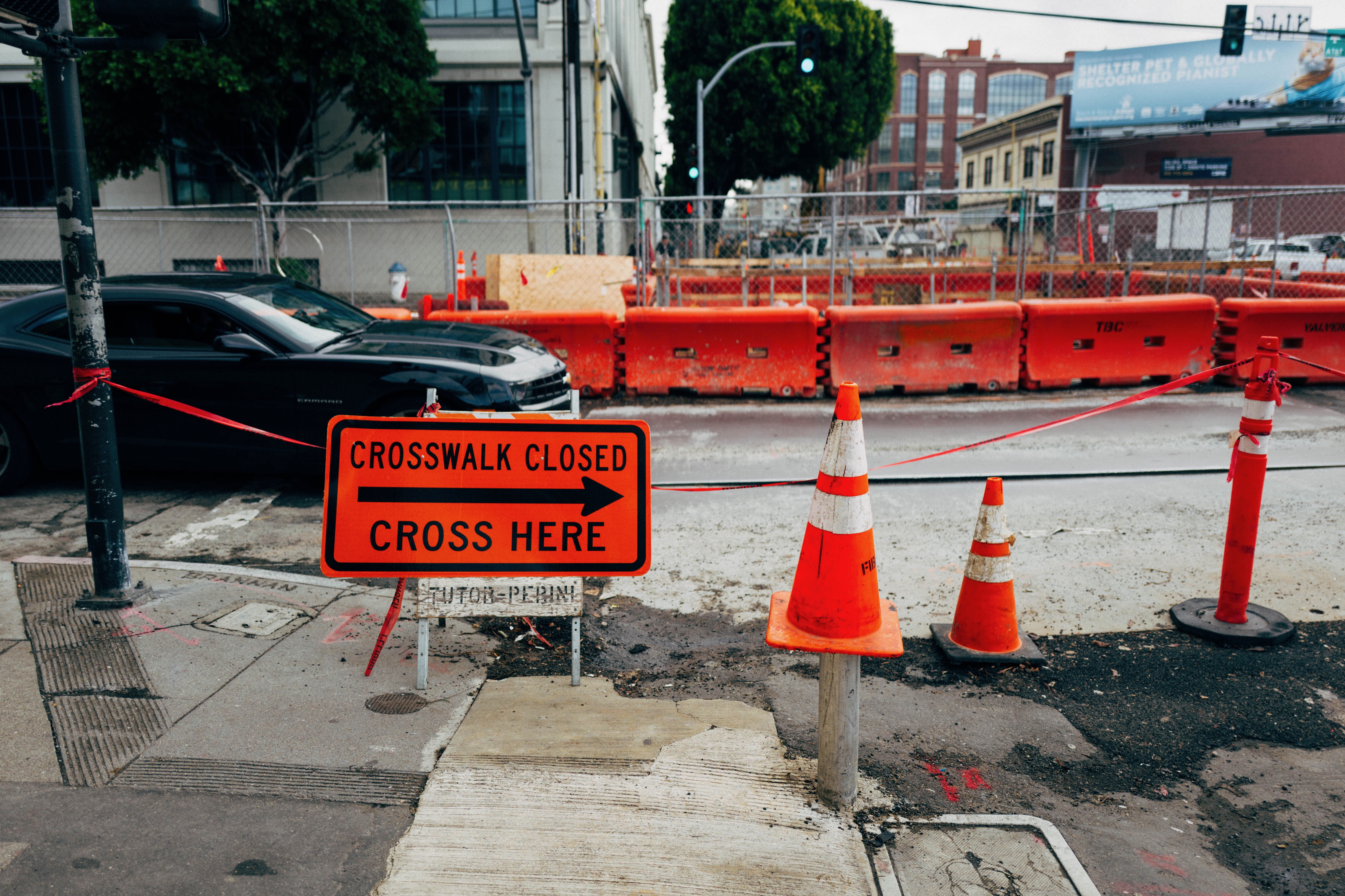 The photograph captures a busy city scene dominated by a closed crosswalk and construction barriers, emphasizing the disruption of everyday urban life. Bright orange cones and signage create a stark contrast against the muted tones of the asphalt and surrounding buildings, conveying a sense of urgency and caution. The overcast skies add a somber mood, hinting at the challenging intersection of infrastructure and pedestrian movement.