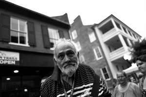 A weathered man gazes thoughtfully into the distance, his striped shirt contrasting with the somber backdrop of a bustling street. The black-and-white tones evoke a sense of introspection and melancholy, while blurred figures of passersby emphasize his isolation in the crowd. Light filters softly, creating a mood that is both reflective and poignant amidst the urban setting.