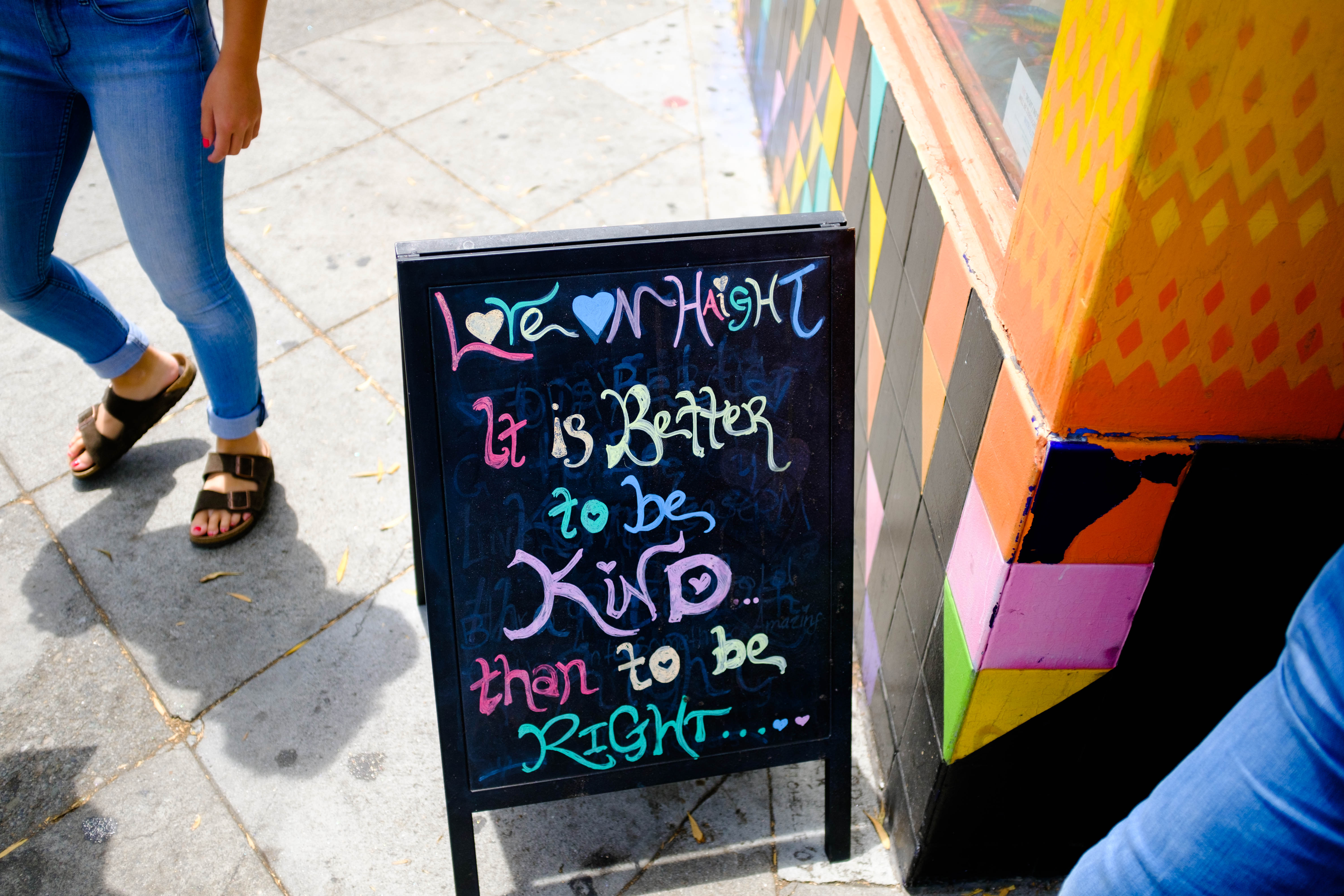 A vibrant sidewalk sign captures a memorable message advocating kindness over being right. Sunlight dances across the scene, highlighting the colorful chalk lettering and creating a warm, inviting atmosphere. A person in casual attire walks past, grounding the composition in everyday life and adding a sense of movement amid the static message.