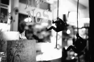 Hanging figurines dangle playfully before a softly-lit interior, their silhouettes stark against the glass. The monochromatic palette evokes a nostalgic and whimsical mood, inviting curiosity about the scene beyond. The gentle blur of the background contrasts with the sharp focus on the monkeys, enhancing their charm and creating a sense of intrigue.