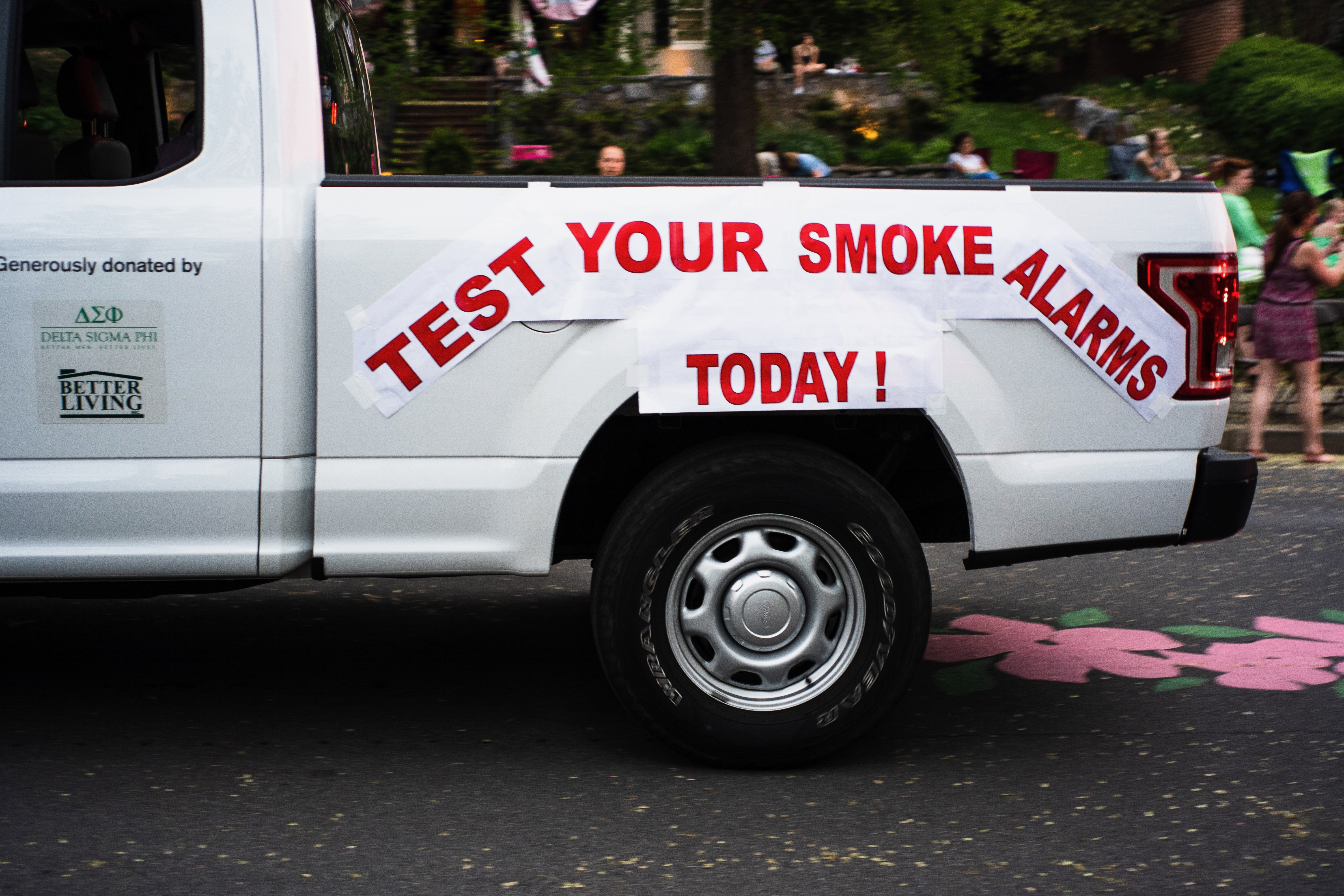 A white pickup truck rolls by with bold red text on its side urging people to 'TEST YOUR SMOKE ALARMS TODAY!' The scene captures a vibrant community event, with festive decorations in the background and onlookers engaged in conversation. The lighting is bright, suggesting a sunny day filled with purpose and urgency in the message.