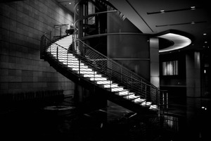 This striking black-and-white photograph showcases a spiraling staircase illuminated by soft lighting, creating a serene and contemplative atmosphere. The sleek lines of the architecture contrast with the dark background, emphasizing the staircase's graceful curve as it invites the viewer's eye upward. The reflections on the polished floor add depth, enhancing the space's modern elegance.