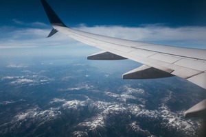 This photograph captures the serene beauty of snow-capped mountains from an airplane wing, evoking a sense of tranquility and wonder. The composition juxtaposes the sleek wing against the expansive landscape, bathed in soft, natural light that highlights the contours of the terrain below. The vibrant blue sky and delicate clouds enhance the sense of altitude, inviting the viewer to reflect on the vastness of the world above.