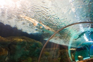 A serene underwater scene captures a shark gliding effortlessly through crystal-clear water. The playful reflections on the water's surface create a tranquil yet exhilarating mood, complemented by the soft natural lighting filtering through. The curved glass tunnel adds a unique perspective, inviting viewers to immerse themselves in this aquatic world.