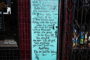 A vibrant turquoise door serves as a canvas for poetic inscriptions, encapsulating dreams and emotions. The playful contrast of colors and the layered graffiti evoke a sense of youthful rebellion and creativity, capturing the essence of urban art culture. The warm afternoon light enhances the textures, making the words pop and inviting viewers to lose themselves in the whimsical narrative.