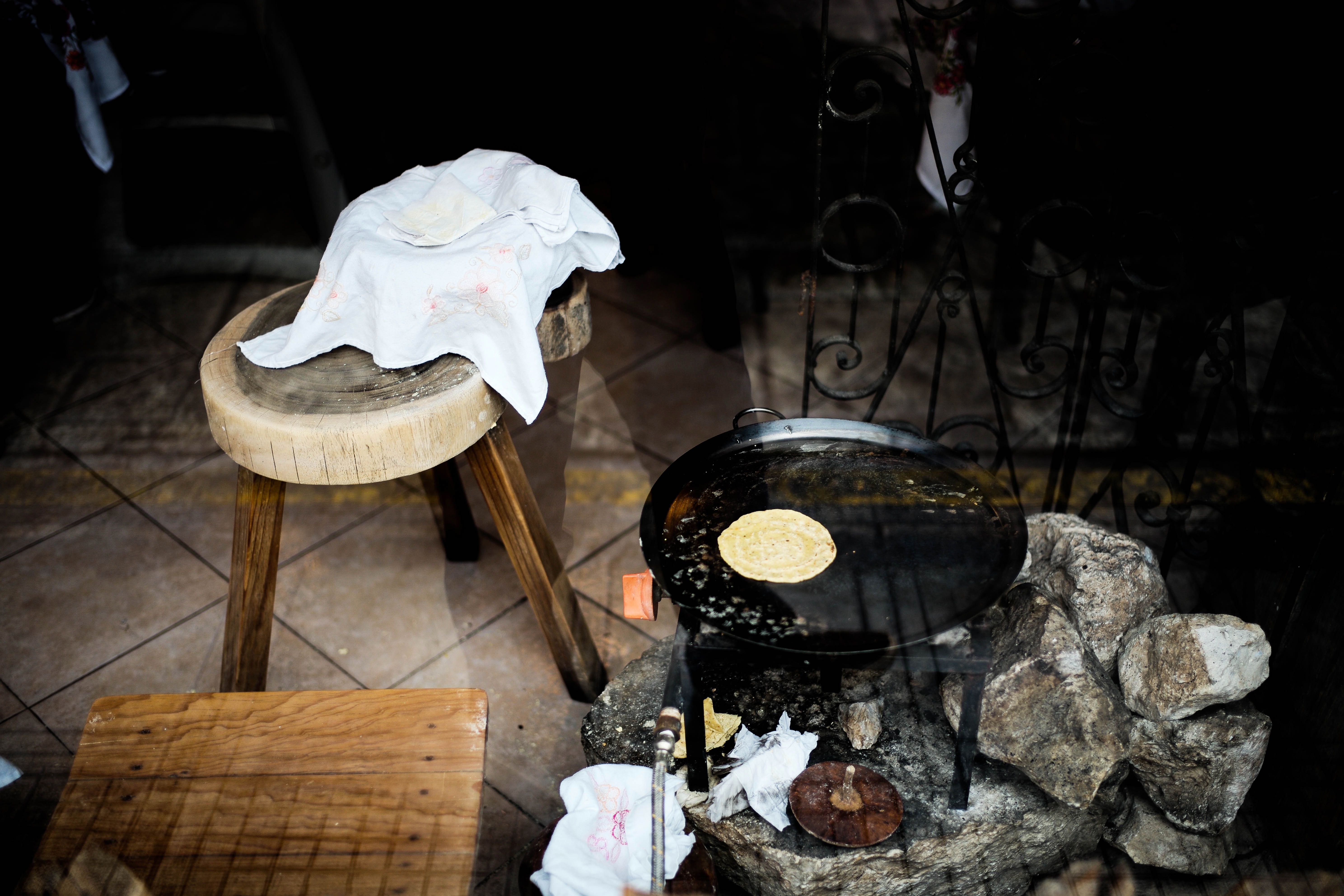 This photograph captures the serene process of tortilla-making, showcasing a rustic scene with a wooden stool and a stone grill. The warm, inviting light highlights the simplicity and authenticity, evoking a sense of nostalgia and appreciation for traditional culinary practices. The composition draws the eye to the centered tortilla slowly cooking, creating a focal point that speaks to the heart of home-cooked meals.