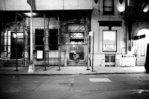 In this stark black-and-white photograph, a solitary figure sits on the steps of a building shrouded in construction scaffolding. The interplay of harsh lighting and shadows creates a somber mood, enhancing the feeling of isolation amidst a bustling urban backdrop. The composition draws the eye to the subject, highlighting their stillness against the dynamic architectural elements surrounding them.