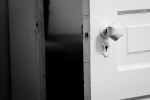 An open door stands slightly ajar, inviting yet enigmatic, with a soft focus that hints at the dark space beyond. The stark black and white contrast emphasizes the textured surface of the door and the intricacies of the old doorknob. This composition evokes a sense of anticipation and the unknown, as shadows loom behind the threshold.