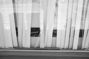 This photograph captures a minimalist view through partially drawn blinds, creating a striking interplay of shadows and light. The monochromatic tones evoke a sense of introspection, inviting the viewer to ponder what lies beyond the slats. The composition emphasizes the contrasting textures of the blinds and the blurred reflections, enhancing a mood of quiet solitude.