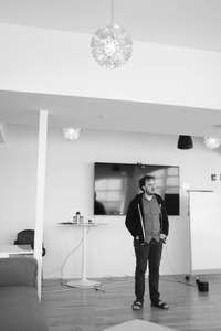 A solitary figure stands in a minimalist, modern room, illuminated by soft natural light. The monochrome palette emphasizes the subject’s thoughtful expression, creating a contemplative mood. The arrangement of furniture and lighting adds to the sense of openness and simplicity, drawing the viewer’s focus to the lone speaker amidst the serene environment.