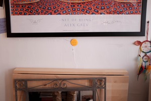 This photograph captures a cozy corner adorned with an Alex Grey artwork, exuding a sense of introspection and creativity. The warm, soft lighting enhances the details of the artwork and the simplicity of the wooden mantle below, while a playful note beckons interaction, adding a whimsical touch. Dreamcatchers hang nearby, inviting a meditative, serene mood into the space.