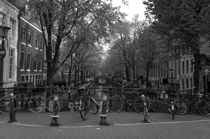 In this monochrome photograph, a tranquil canal lined with bicycles invites contemplation. The overcast lighting enhances the quiet mood, casting soft shadows among the trees and historic buildings that frame the scene. The composition, centered on the canal, draws the eye down the pathway, suggesting a peaceful journey through this iconic urban landscape.