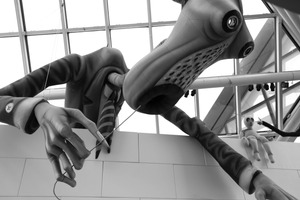 A towering, whimsical figure of a creature with a dog-like head looms over a minimalist white wall, capturing attention with its oversized hands and playful demeanor. The stark black-and-white composition enhances the surreal atmosphere, creating a sense of both charm and unease as shadows play across its features. The high-angle perspective emphasizes the creature's imposing presence, suggesting a blend of humor and absurdity in its setting.