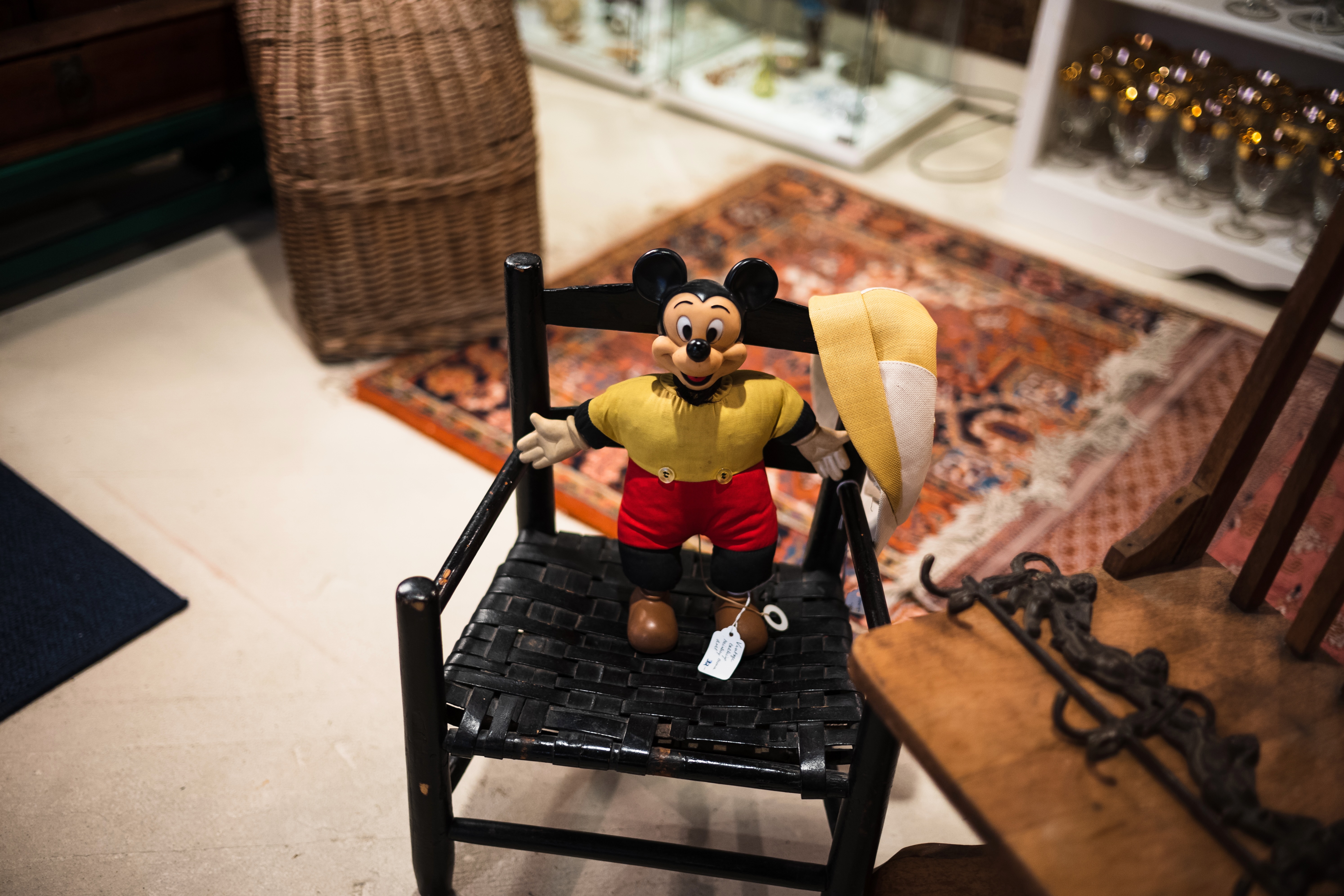 In a cozy vintage store, a cheerful toy character with bright colors sits casually on a woven chair, evoking a sense of playful nostalgia. Soft, warm lighting enhances the charming atmosphere, while the ornate rug and rustic surroundings create a contrast between whimsy and history. The overall mood is lighthearted, inviting a smile from onlookers.