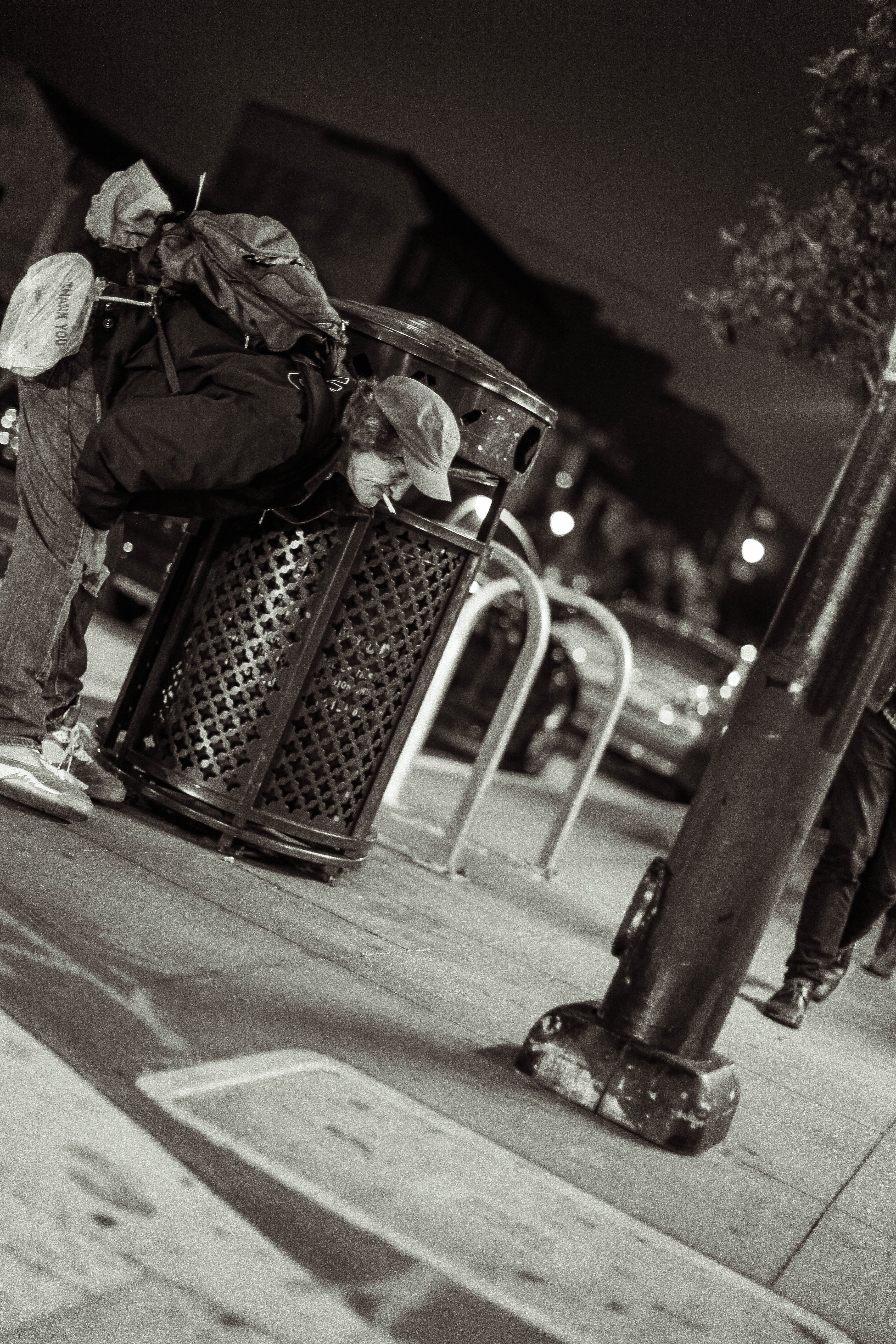 A solitary figure leans over a trash can in a dimly lit urban night, embodying the struggle of survival. The stark black-and-white contrast highlights the emotional weight of the scene, drawing attention to the subject's weary posture and the surrounding emptiness. The composition emphasizes the disconnect in a bustling environment, evoking a sense of isolation and contemplation.