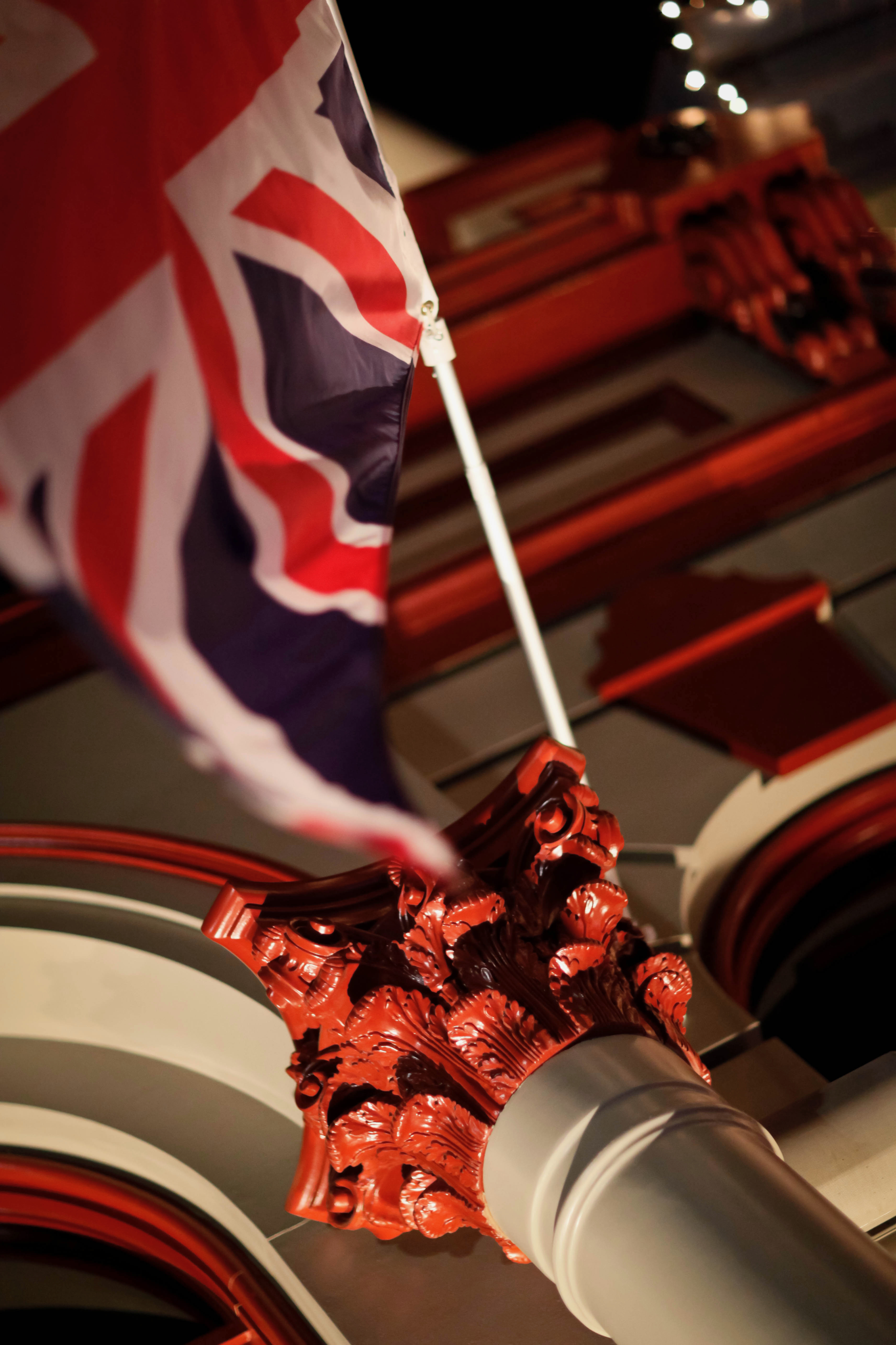 The photograph captures an upward view of a vibrant red architectural column adorned with intricate details, contrasting sharply with the fluttering British flag above. The warm lighting accentuates the textures of the column, creating a nostalgic atmosphere, while the darkened surroundings evoke a sense of calm. This composition draws the eye upward, blending the historical significance of the building with a serene evening ambiance.