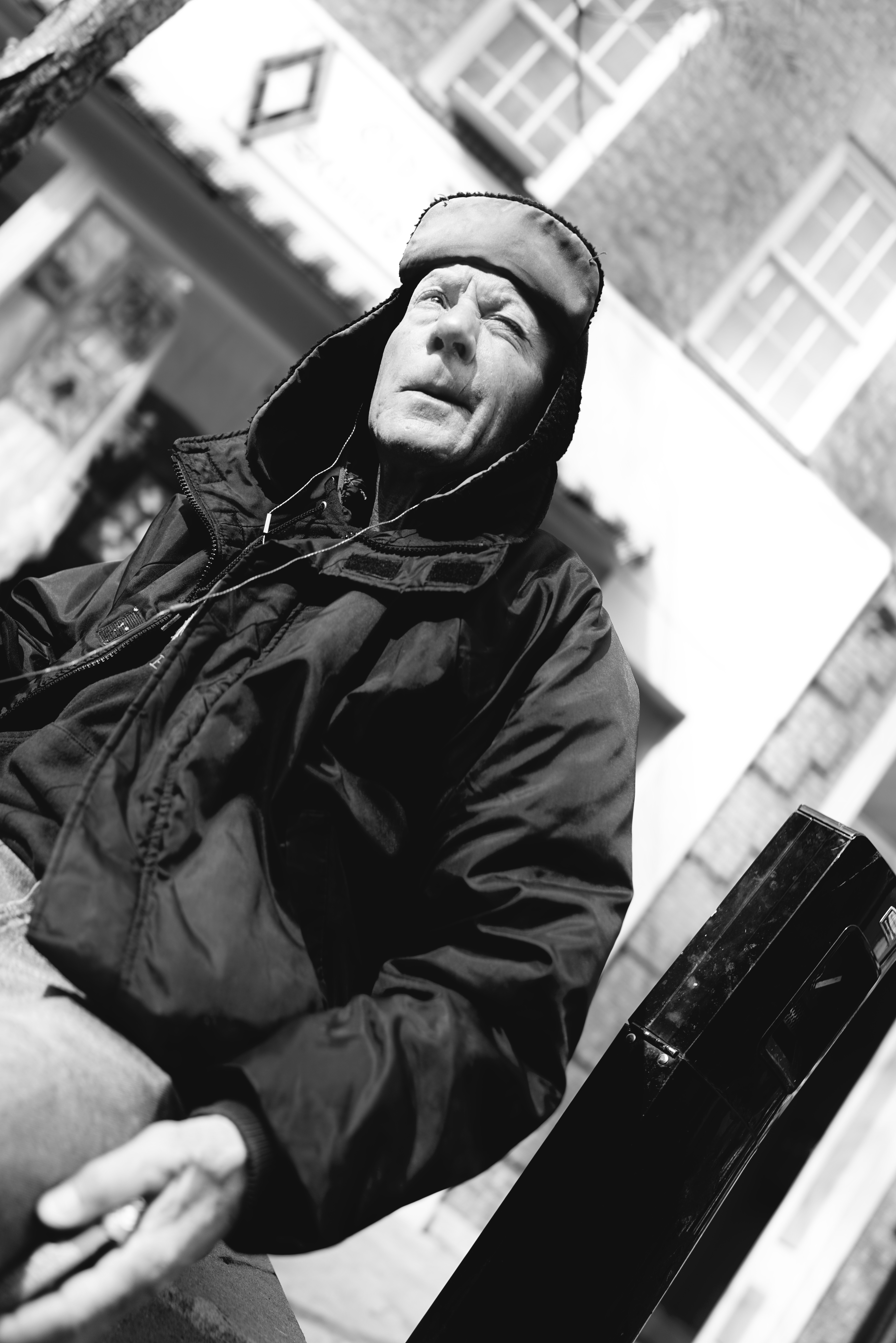 A solitary figure sits in contemplation, cloaked in a heavy jacket and ear-flapped hat, casting a wary gaze at the world around him. The stark black-and-white composition emphasizes the contours of his weathered face and the textures of his clothing, evoking a sense of introspection and resilience. Soft lighting highlights the quiet backdrop of an urban setting, enhancing the mood of solitude and reflection.