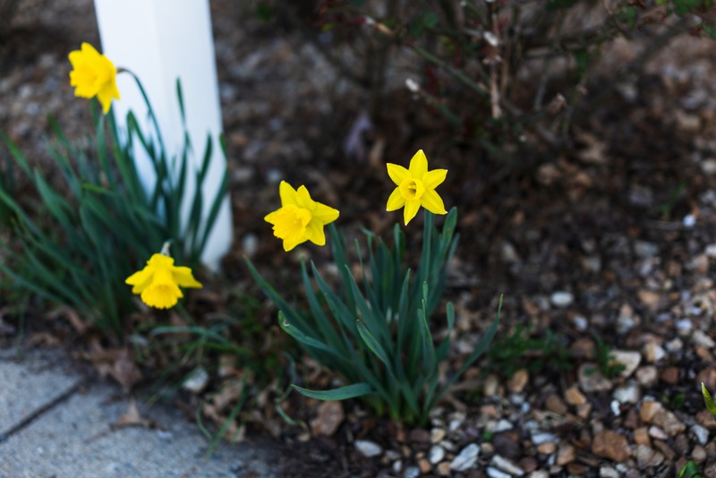 Bright daffodils burst with vivid yellow against a muted backdrop of earth and stone. The composition captures a serene moment, with soft natural light illuminating the flowers and evoking a sense of renewal. Their lively presence brings warmth and cheer to the otherwise subdued landscape.