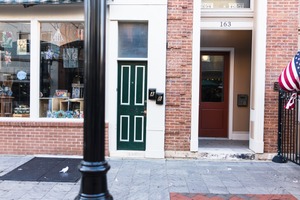 This photograph captures a quaint street scene featuring two contrasting doorways: a vibrant green door beside a warm-toned entrance. The composition draws the eye horizontally across the brick backdrop, with natural light softly illuminating the space, enhancing the inviting atmosphere. The subtle details, like the welcoming 'Open' sign and a lone pigeon, evoke a sense of everyday life and community charm.