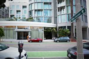 This photograph captures a modern hotel entrance, characterized by its sleek architecture and large glass windows reflecting the surrounding palm trees. The muted lighting creates a calm, sophisticated mood, while a pair of casually dressed individuals stand outside, hinting at a narrative of urban leisure. A vibrant red car adds a pop of color to the scene, complementing the contemporary urban setting.
