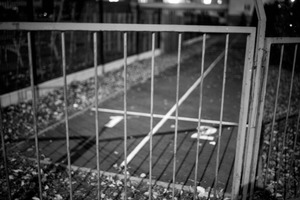 The photograph captures a dimly lit, fenced-off track, where the stark white numbers '1' and '2' fade into the shadows. The surrounding leaves hint at the passage of time, evoking a sense of nostalgia and abandonment. The monochrome tones amplify the mood, suggesting a quiet stillness that contrasts with the often-bustling nature of such spaces.