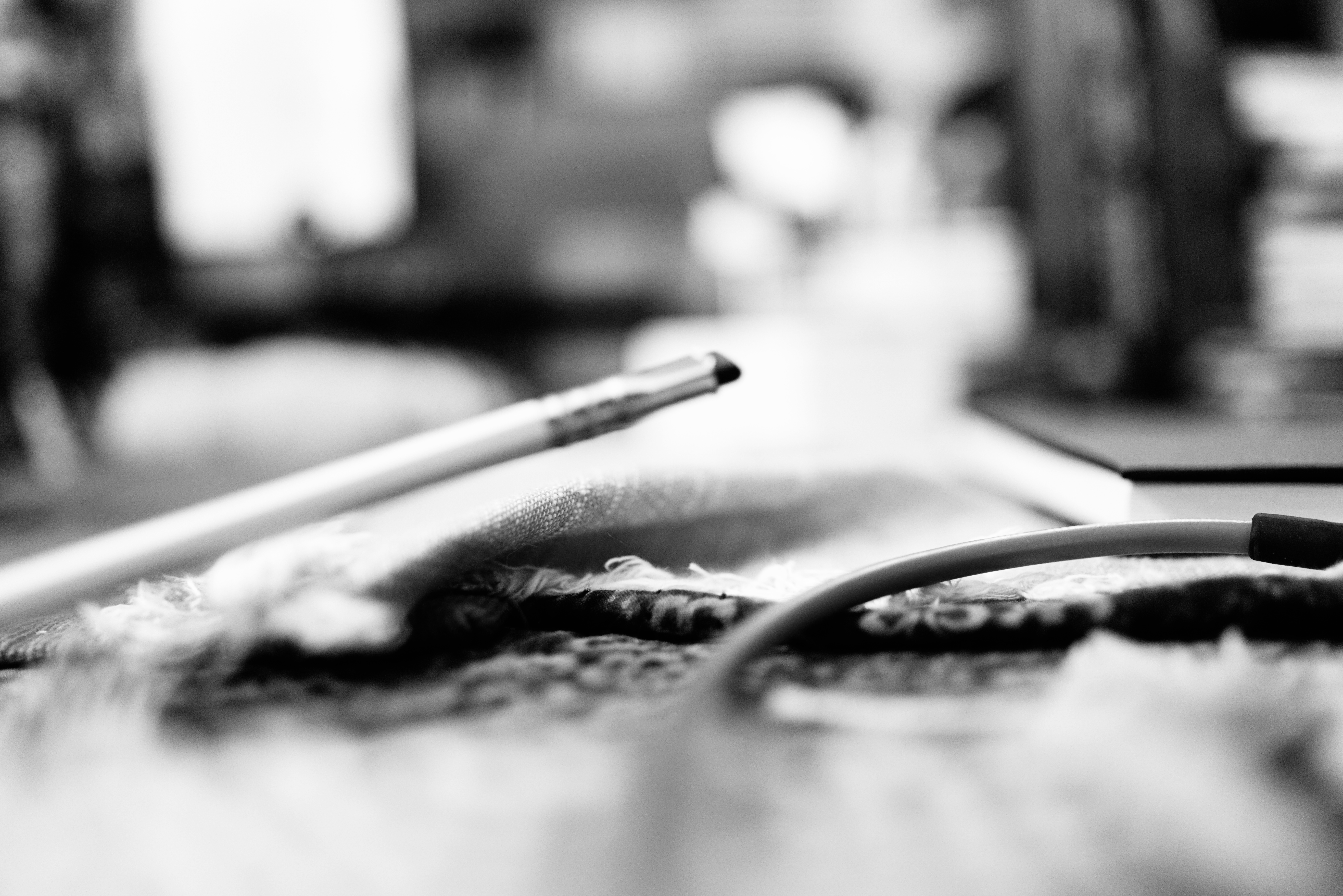 This black-and-white photograph captures a close-up view of a workspace in soft focus, emphasizing a pen resting on textured fabric alongside a circular cable. The shallow depth of field creates a dreamy, contemplative mood, while the play of light hints at a creative atmosphere filled with possibility. The abstract composition invites reflection on the quiet moments of inspiration amid daily tasks.