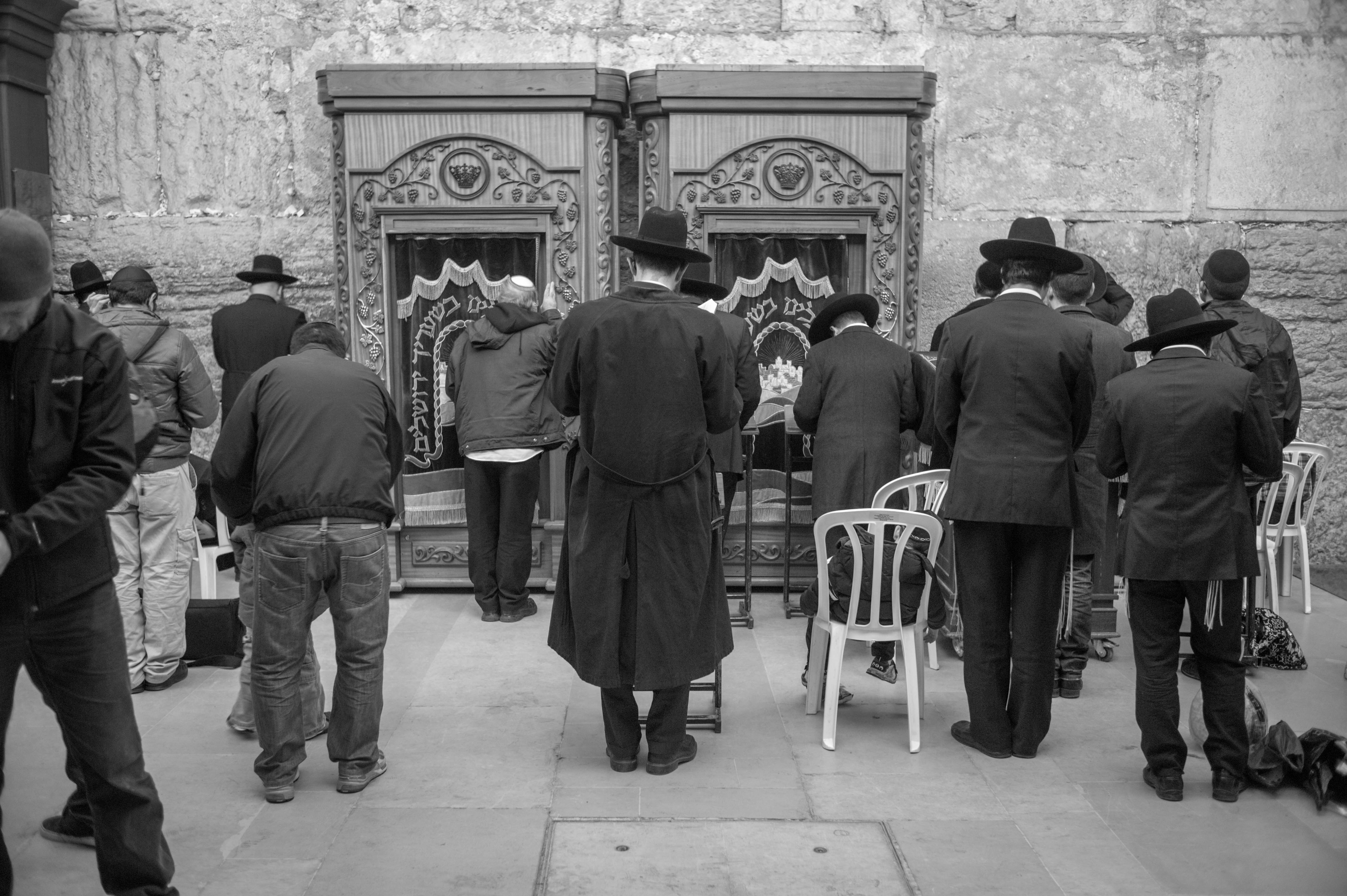 In this black-and-white photograph, a group of men dressed in traditional attire stands in solemn prayer before ornate wooden structures. The subdued lighting casts a contemplative mood, highlighting their focused postures and the spiritual significance of the moment. The composition draws the viewer's eye to the intricate design of the backgrounds, creating a juxtaposition between the details of the surroundings and the intensity of their devotion.