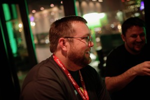 Captured in a dimly lit setting, two men share a lighthearted moment, their expressions filled with warmth and camaraderie. The soft glow from the background highlights their relaxed demeanor, while the vibrant colors in the background create a lively atmosphere, enhancing the sense of connection and joy in the scene.