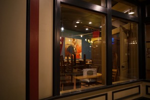 This photograph captures a serene nighttime view of a restaurant through its large window, where empty tables are neatly arranged under soft, warm lighting. The vibrant artwork on the wall contrasts with the subdued surroundings, evoking a feeling of stillness and anticipation. As chairs sit stacked, the ambiance suggests a moment of pause before the return of lively gatherings.