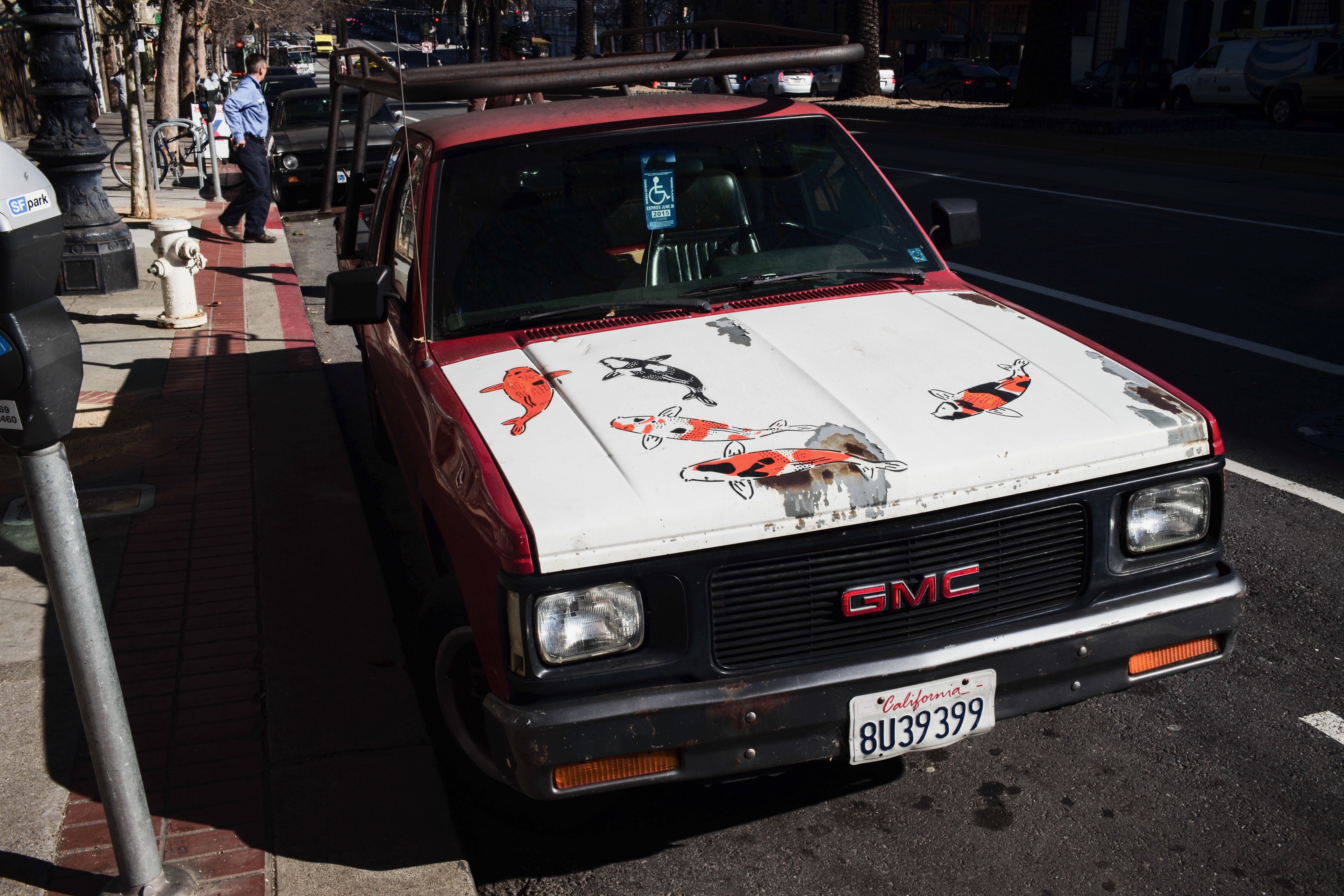 A vintage GMC truck, adorned with playful koi fish art, stands under the bright sunlight on a bustling city street. The vibrant colors contrast with the truck's weathered exterior, creating a sense of character and nostalgia. The busy backdrop, with pedestrians and lamp posts, adds an energetic vibe to this quirky scene.
