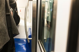 This photograph captures an intimate moment within a subway carriage, framed between the sleek, reflective surfaces of glass and metal. Soft, ambient lighting casts a gentle glow, enhancing the sense of quiet anticipation and the shared journey of commuters. The scene evokes a feeling of both solitude and connection in the busy urban landscape.