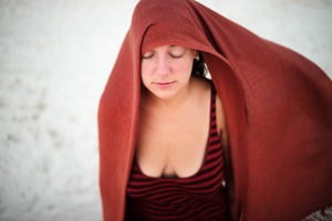 The photograph captures a young woman draped in a flowing rust-colored cloth, creating a sense of intimacy and contemplation. Soft, diffused lighting accentuates her tranquil expression against a minimalist, sandy background, enhancing the mood of peaceful solitude. The composition focuses on her serene visage, inviting viewers to contemplate the layers of emotion and connection to nature.