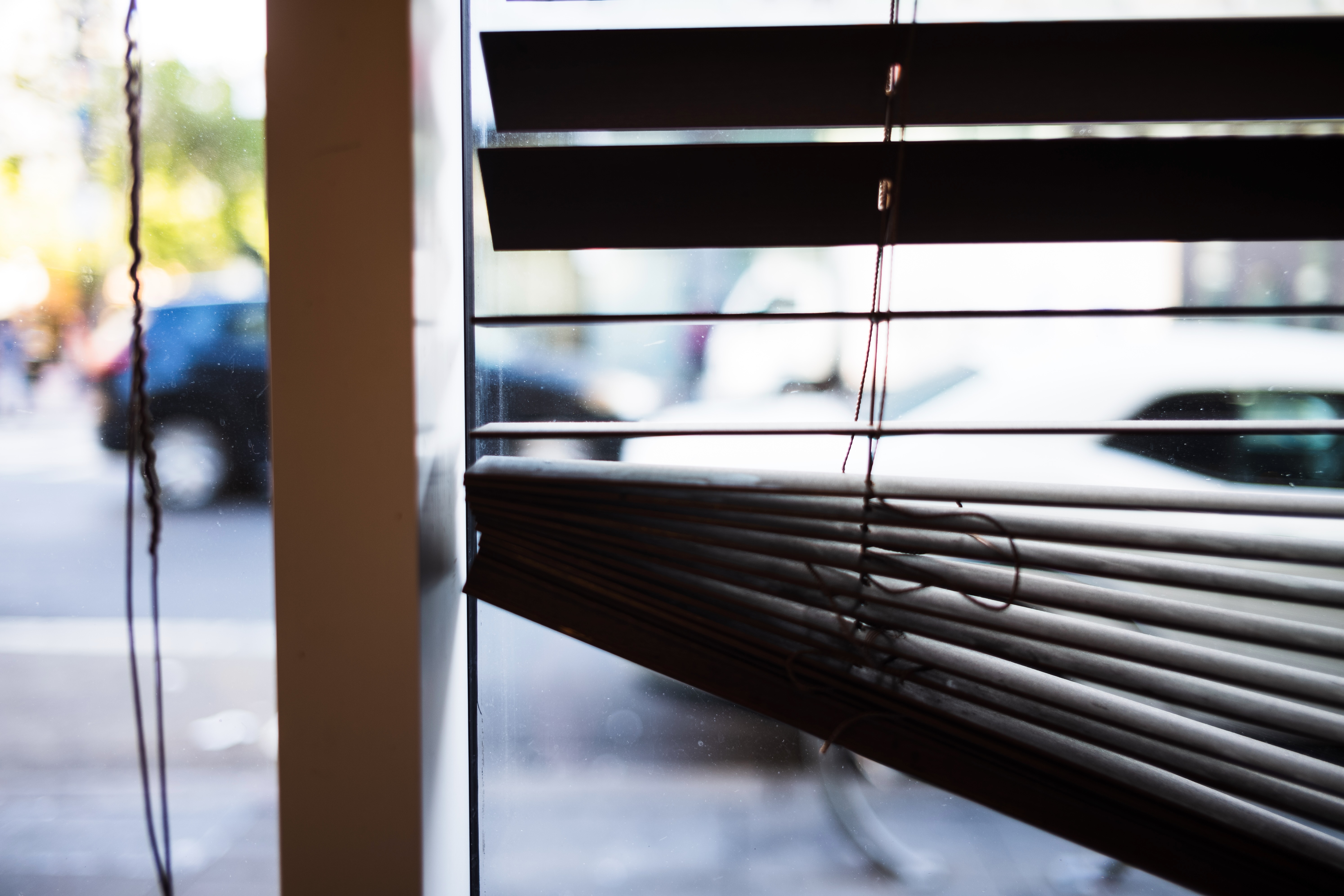 This photograph captures a moment of quiet intrigue as the interplay of light and shadows filters through partially opened blinds. The blurred outlines of the street outside create a sense of detachment, inviting the observer to ponder the world beyond the glass. Warm, natural light enhances the mood, giving a soft glow to the scene, while the geometric lines of the blinds offer a contrast of structure and openness.