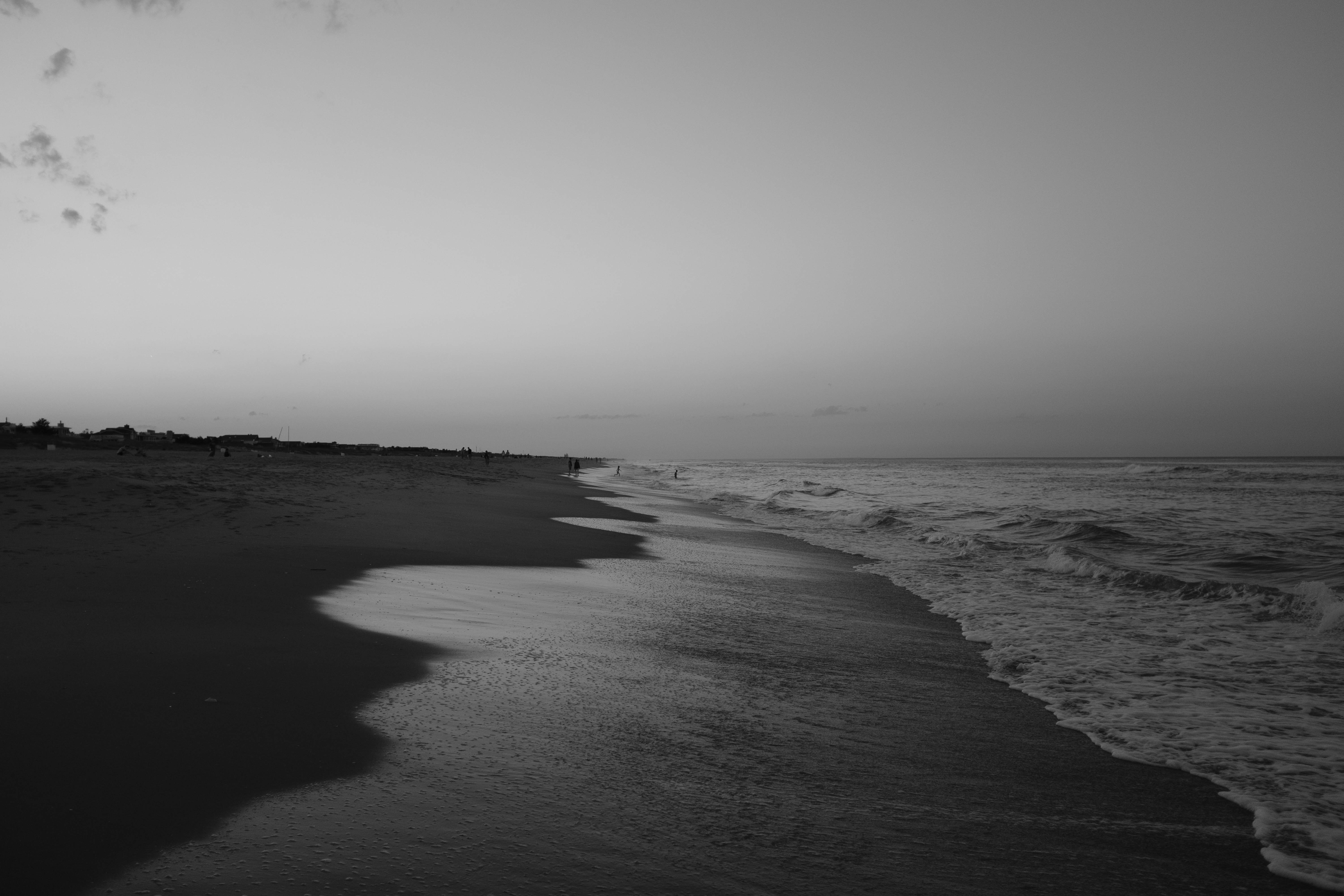The photograph captures a tranquil beach scene at dusk, rendered in striking black and white. Gentle waves caress the shoreline, their delicate reflection contrasting with the soft, fading light of the sky. The composition leads the eye along the coastline, evoking a sense of solitude and peaceful introspection.