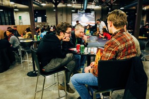 In a bustling game night setting, four friends huddle around a table, deeply engaged in a board game, their expressions a mix of concentration and camaraderie. The warm, industrial lighting casts a cozy glow over the space, while the lively background hums with laughter and chatter. This composition captures a moment of connection, showcasing the joy of shared experiences in a vibrant atmosphere.