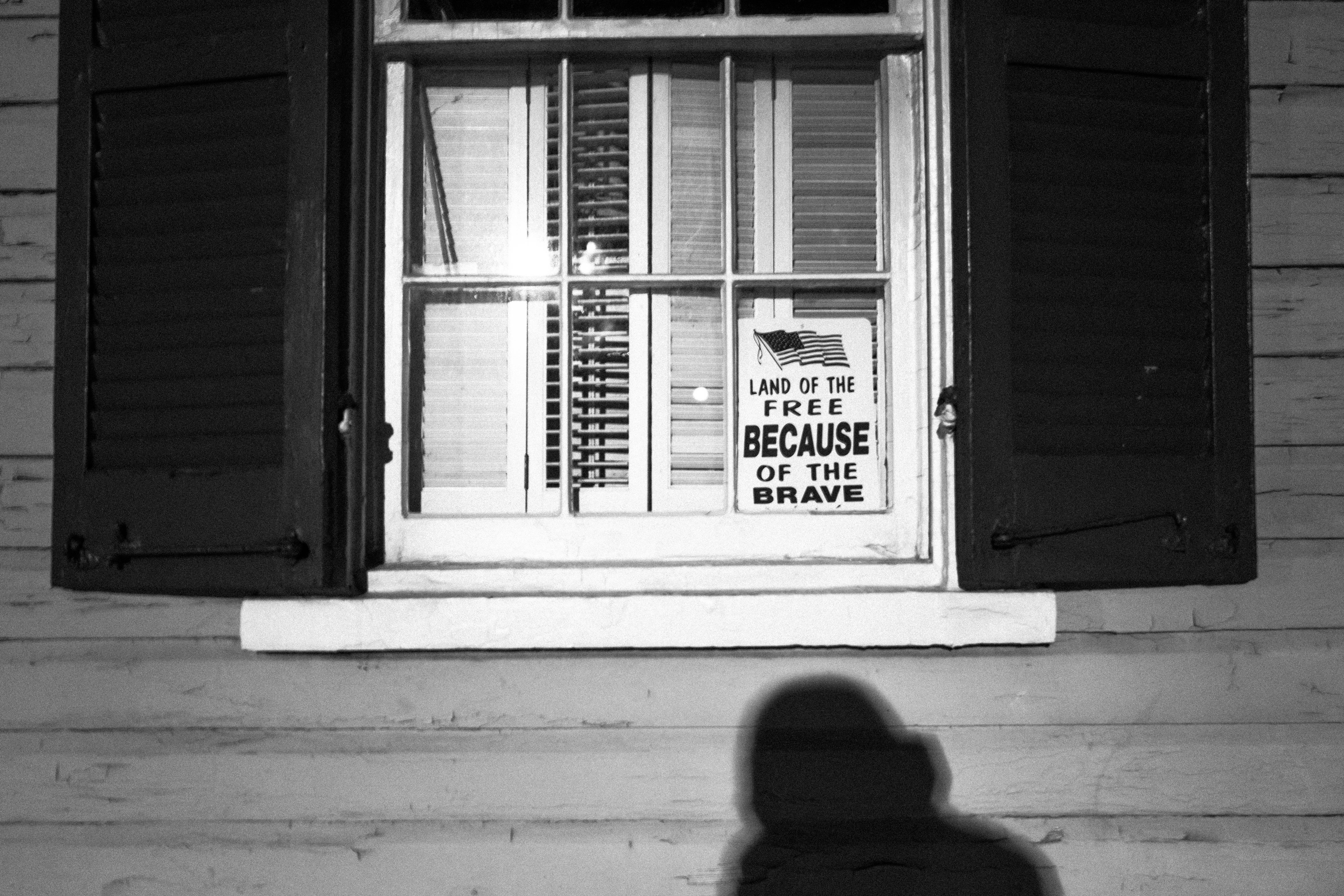 A black-and-white photograph captures a window adorned with a patriotic sign that reads, 'Land of the Free Because of the Brave.' The composition highlights a looming shadow, suggesting a quiet moment of contemplation, while the subdued lighting adds an air of solemnity to the scene, evoking themes of honor and remembrance.