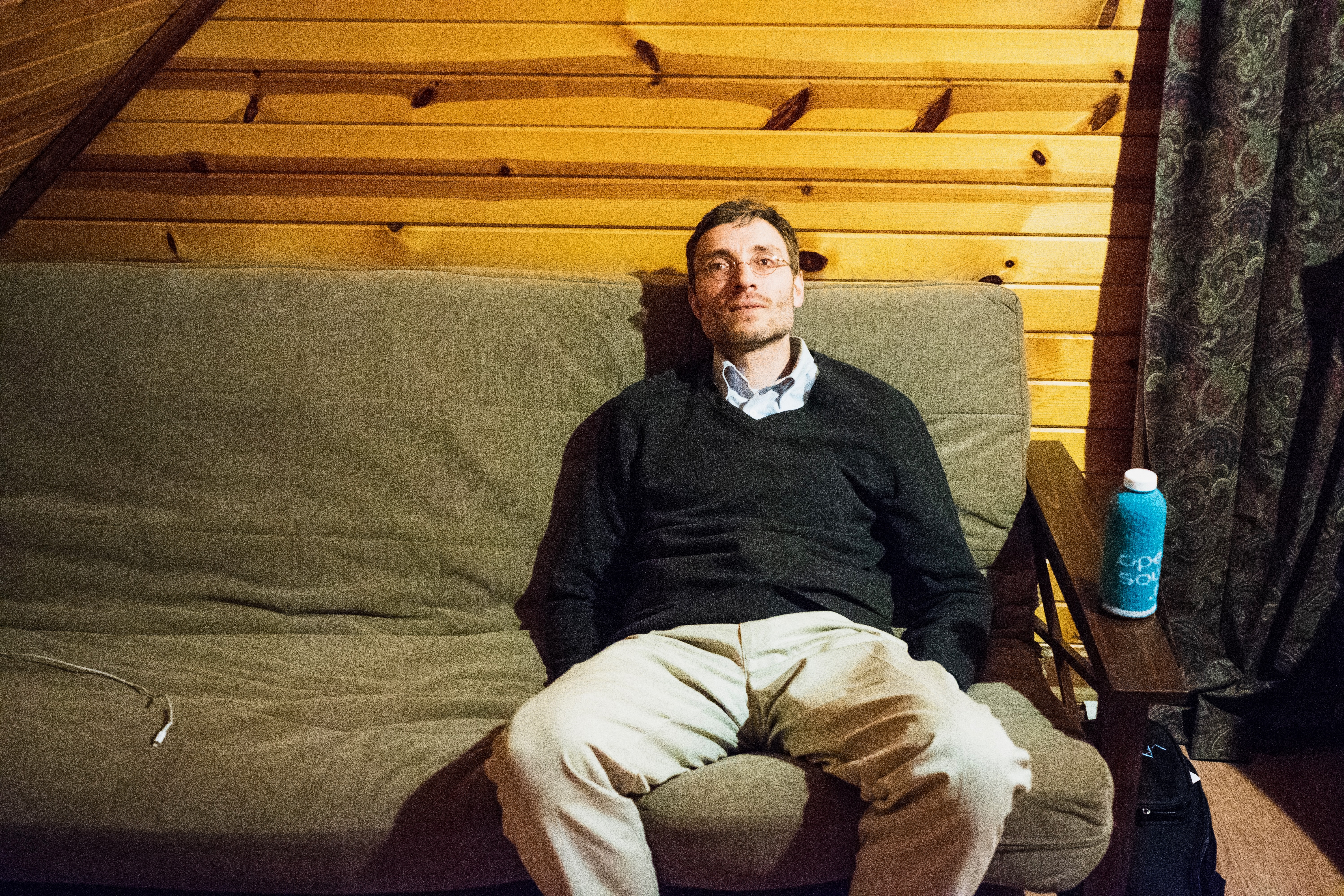 In a cozy, wooden room, a man sits serenely on a couch, exuding a sense of calm contemplation. The soft, warm lighting creates a relaxed atmosphere, accentuating his thoughtful expression as he gazes into the distance. The natural tones of the wood and fabric contrast with the vibrant blue water bottle nearby, adding a subtle pop of color to the scene.