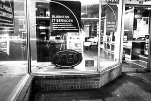 The photograph captures a late-night scene of a computer repair shop illuminated by an 'Open' sign, drawing attention amidst the shadows. The stark contrast of black and white enhances the mood of a quiet urban night, evoking a sense of solitude and the unwavering presence of commerce. The composition focuses on the welcoming glow of the sign, juxtaposed with the closed storefronts surrounding it, suggesting both opportunity and stillness in the bustling city.