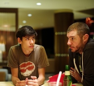 The photograph captures two young men engaged in an intense, thoughtful conversation, their expressions reflecting various shades of curiosity and contemplation. The ambient lighting creates a warm, intimate atmosphere, highlighting their features and the subtle details of their surroundings. The composition, with a soft focus on the background, draws attention to their connection and the moment shared between them.