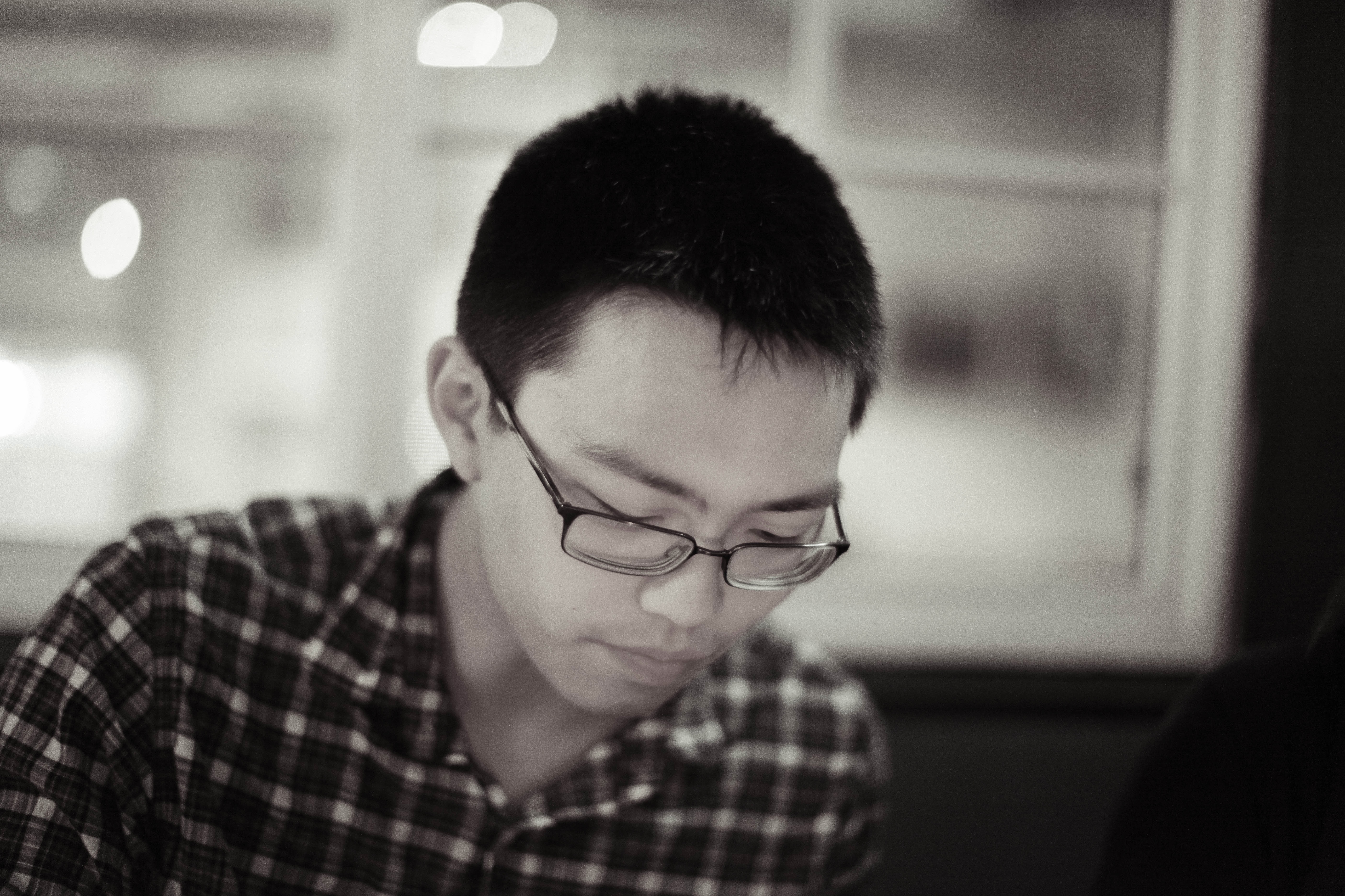 This intimate black-and-white photograph features a young man immersed in thought, his gaze lowered as he concentrates on something in front of him. The soft lighting highlights the contours of his face, while the blurred background creates a cozy, contemplative atmosphere, inviting the viewer to ponder his thoughts. The checked pattern of his shirt adds a touch of texture, contrasting with the smooth simplicity of the scene.