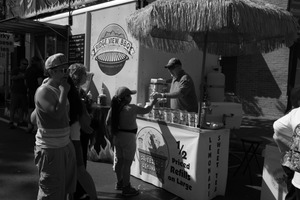 In this bustling black-and-white scene, a lively barbecue stand draws in a mix of patrons, capturing the essence of a community gathering. The contrast between the light and shadow creates a dynamic atmosphere, highlighting the interaction between the vendor and a young customer eagerly reaching for a refreshing drink. The thatched umbrella adds a touch of tropical flair, enhancing the warm, inviting mood of summer festivity.