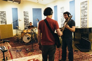 In a cozy recording studio, three musicians are engaged in a lively jam session, embodying the creative spirit of collaboration. Warm lighting casts a soft glow on the eclectic decor, enhancing the intimate atmosphere while the guitars and drums set the rhythmic energy. The camaraderie between the band members is palpable, making this moment feel alive with potential and inspiration.